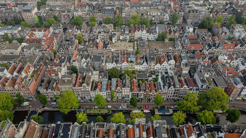 Aerial perspective of Amsterdam's canal system in Jordaan district - revealing the UNESCO World Heritage canal ring structure
